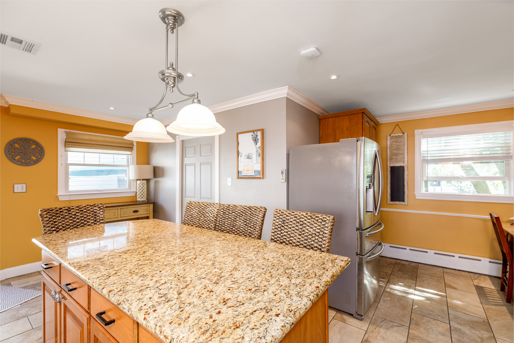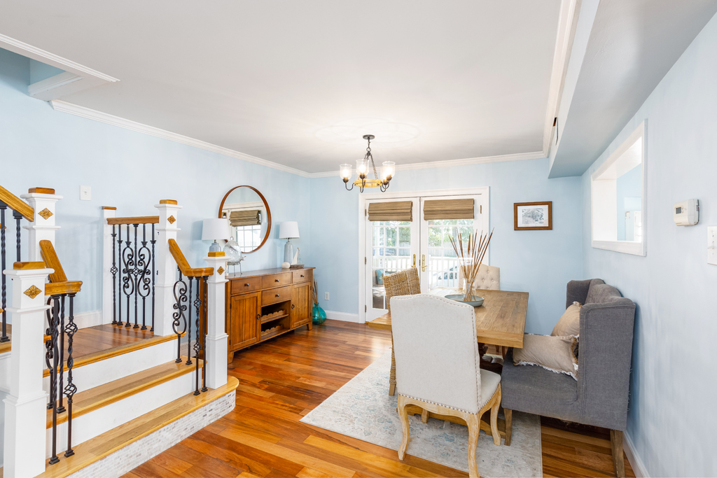 When you enter the front door, you're greeted with a vast main living room naturally lit by the summer sun. The room is spacious with plenty of seating around a sectional sofa and additional chairs for the whole family to gather around. When you walk through the living room and up a small step, you'll get to the dining area where you'll be able to enjoy a home cooked meal or takeout from one of the many fantastic restaurants walking distance from the home. Keep going and you reach the welcoming front porch where the whole family can lounge on the outdoor sofa and table.