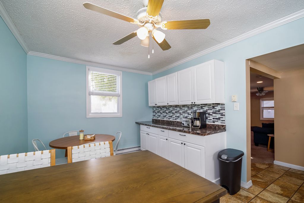 Head back inside and walk toward the back of the house and you'll find the sizable kitchen, equipped with high end appliances and a large kitchen island with additional seating. You'll also have a personal coffee station with plenty of coffee, tea, creamer and sugar to get the morning caffeine boost we all need! Through the kitchen back door, you'll get to the private, fenced back yard which boasts a large back patio, additional tables and chairs for more seating, a brand new weber grill awaiting the summer BBQ you've been dreaming of.